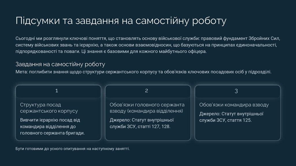 Підсумки та завдання на самостійну роботуСьогодні ми розглянули ключові поняття, що становлять основу військової служби: правовий фундамент Збройних Сил,