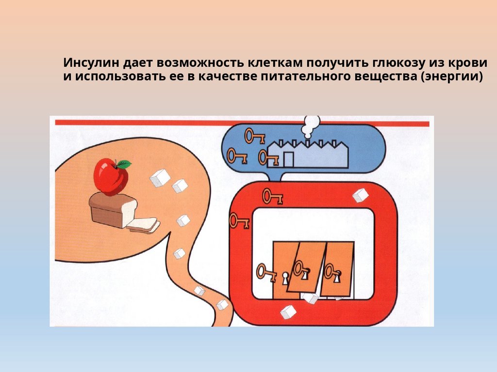 Инсулин дает возможность клеткам получить глюкозу из кровии использовать ее в качестве питательного вещества (энергии)