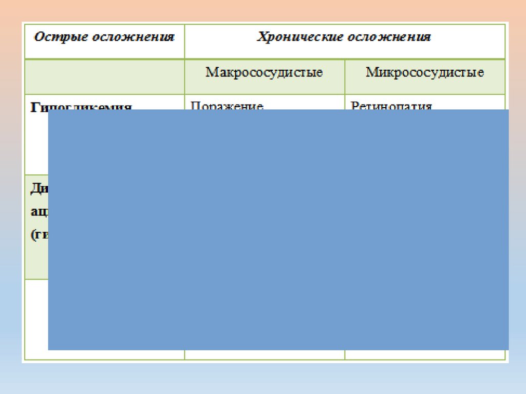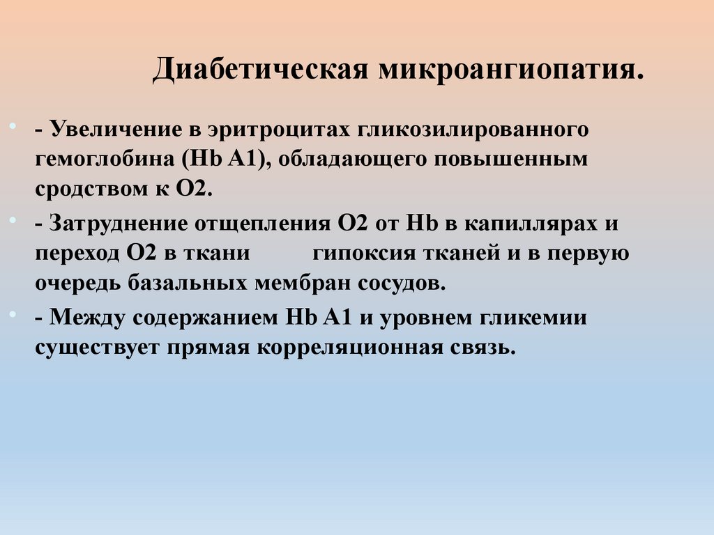 Диабетическая микроангиопатия.• - Увеличение в эритроцитах гликозилированного