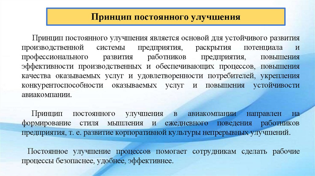 Принцип постоянного улучшения в авиакомпании направлен на