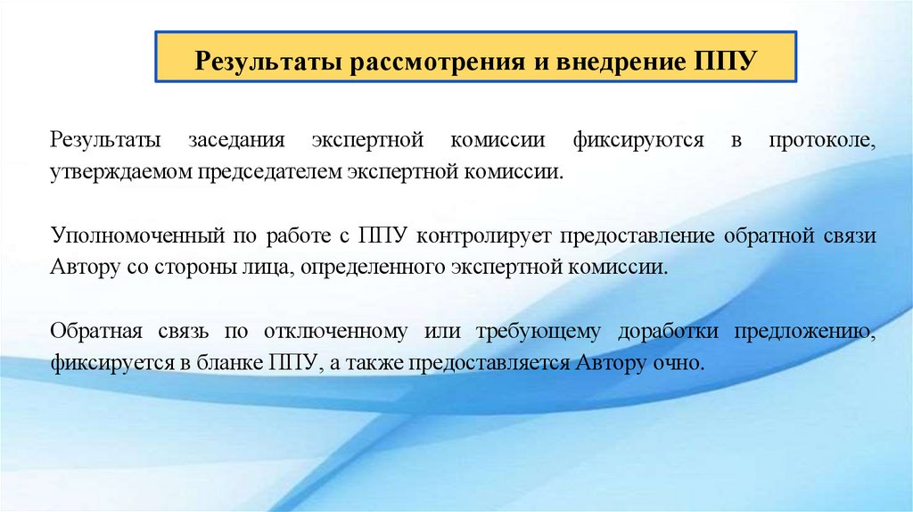 Результаты рассмотрения и внедрение ППУРезультаты заседания экспертной комиссии фиксируются