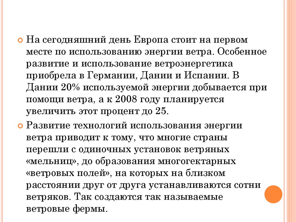 На сегодняшний день Европа стоит на первомместе по использованию энергии ветра. Особенное