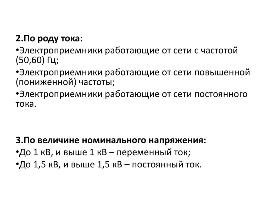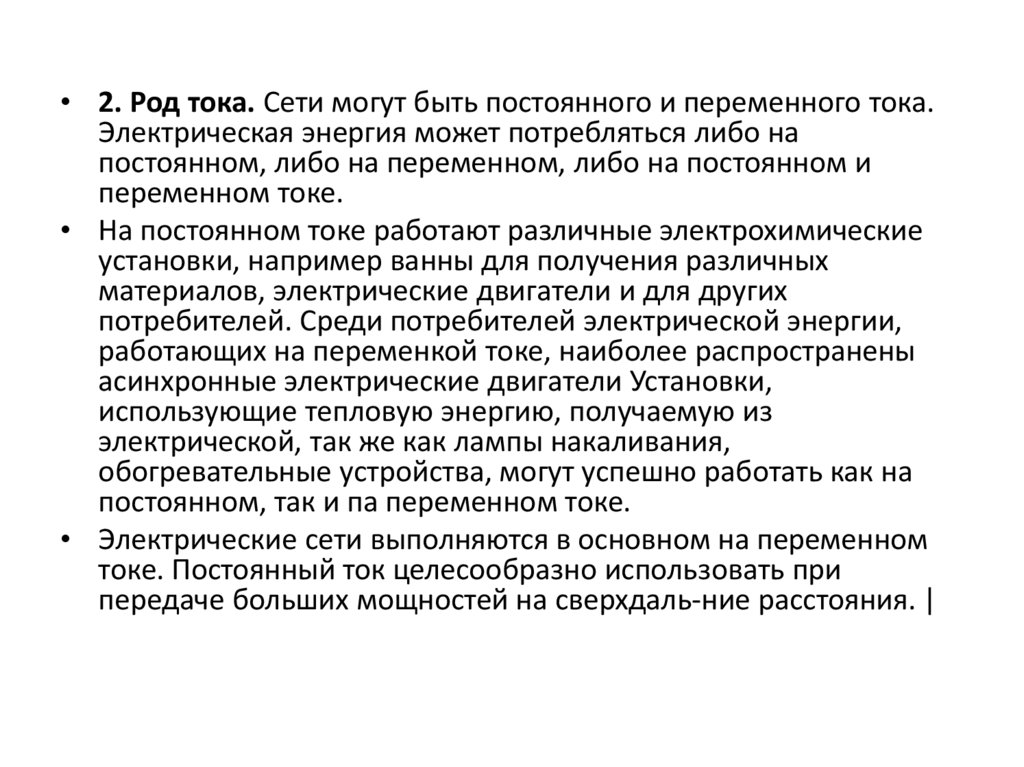 • 2. Род тока. Сети могут быть постоянного и переменного тока.Электрическая энергия может потребляться либо на