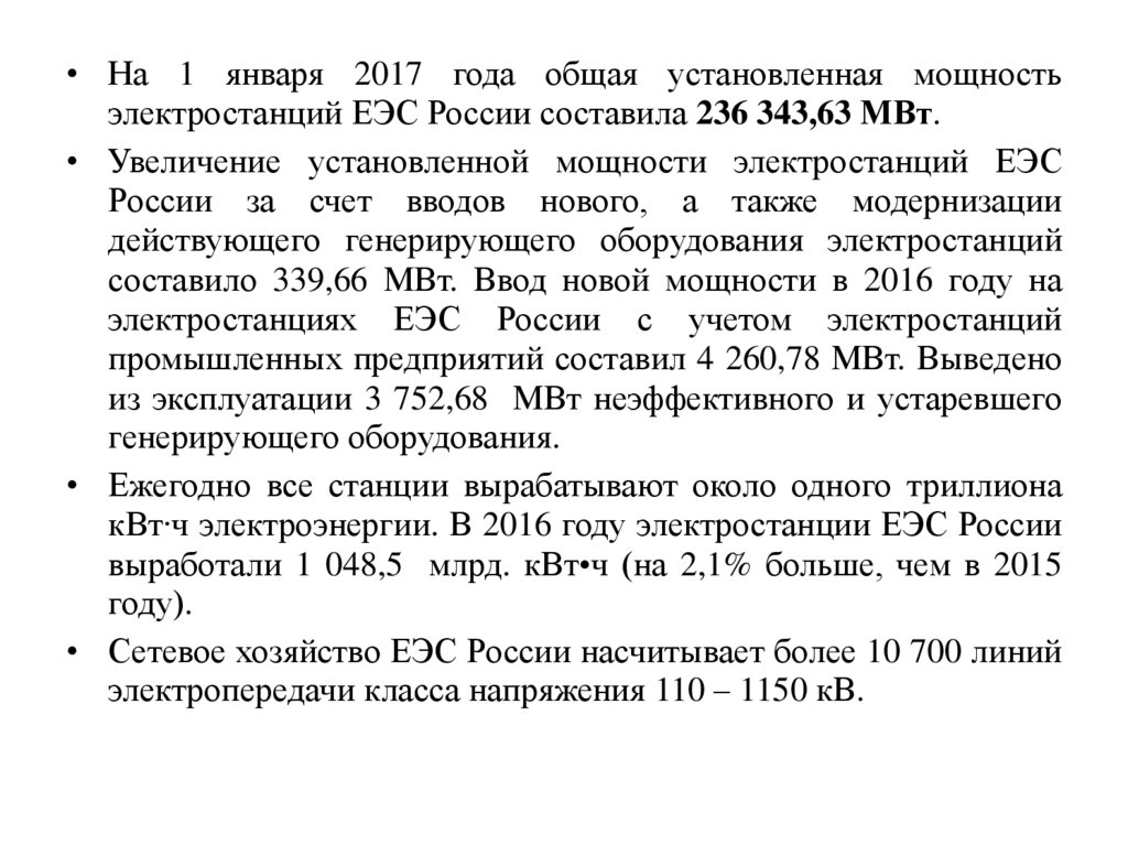 • На 1 января 2017 года общая установленная мощностьэлектростанций ЕЭС России составила 236 343,63 МВт.