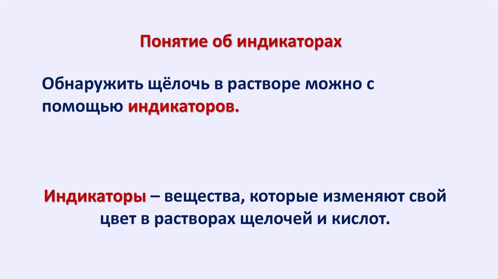 Понятие об индикаторахОбнаружить щёлочь в растворе можно с