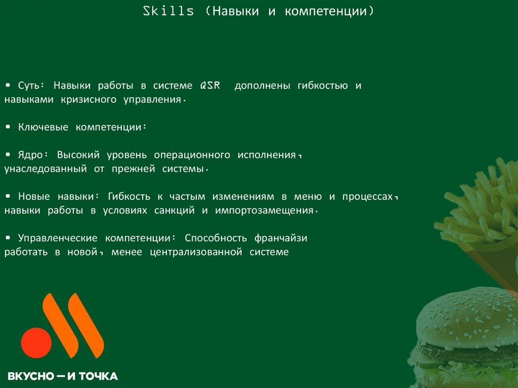 Skills (Навыки и компетенции)• Суть: Навыки работы в системе QSR
