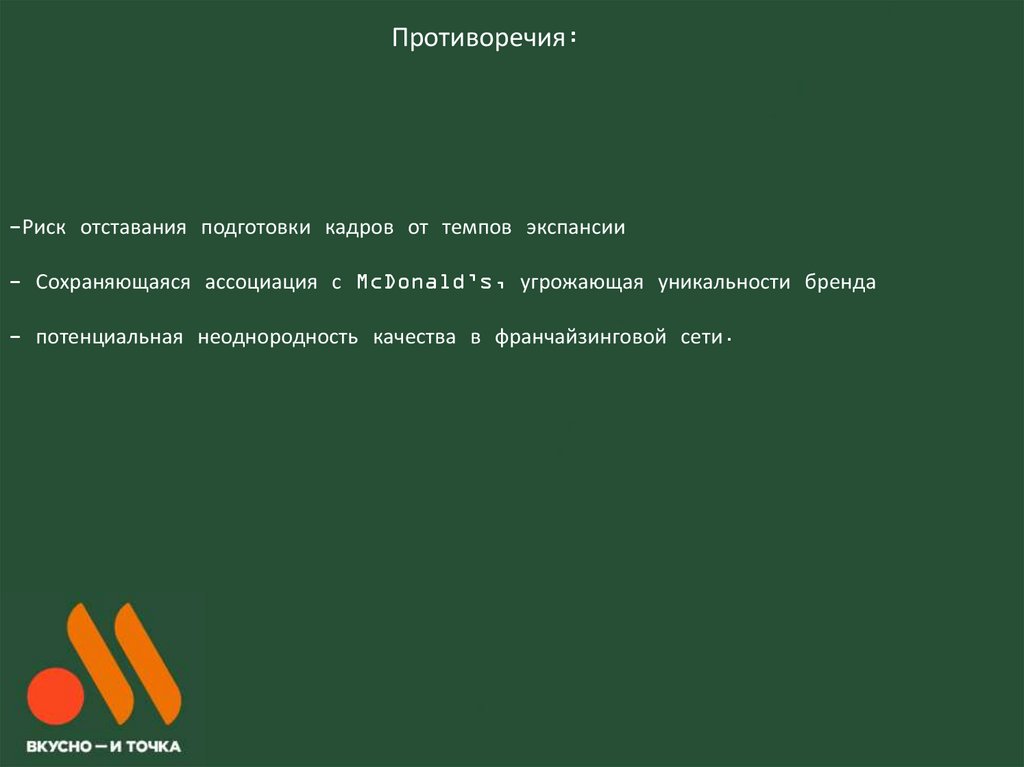 Противоречия:-Риск отставания подготовки кадров от темпов экспансии