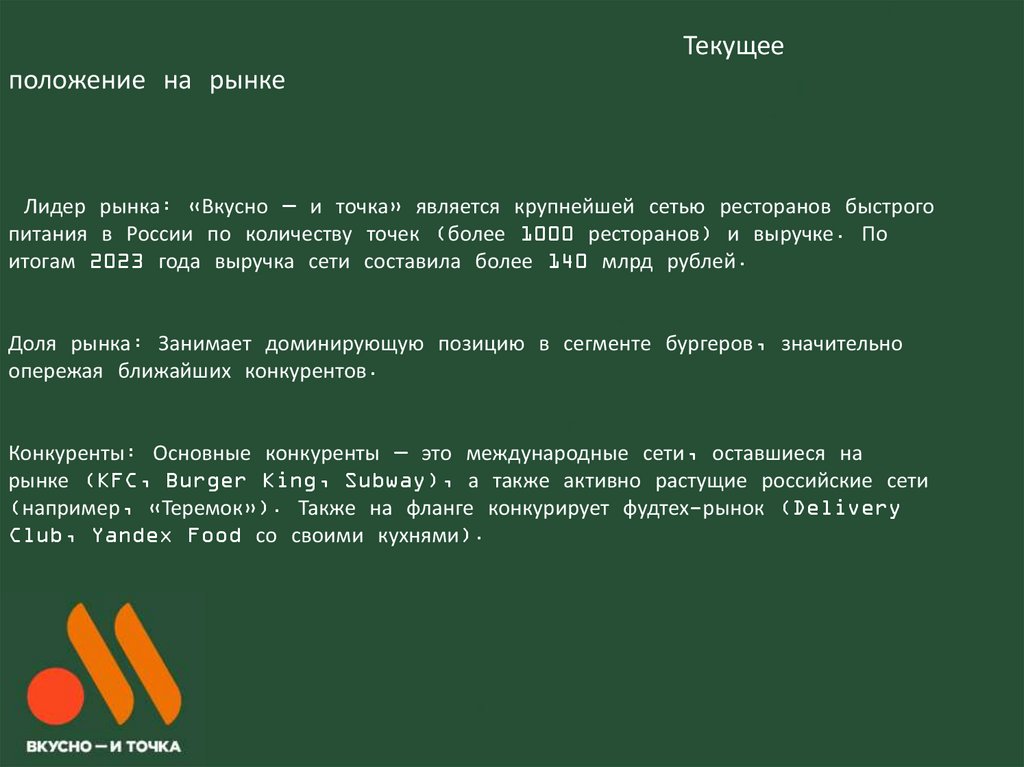 (например, «Теремок»). Также на фланге конкурирует фудтех-рынок (Delivery
