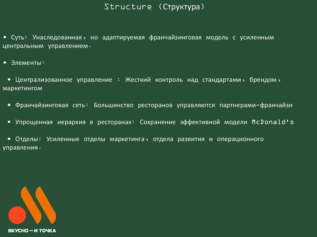 Structure (Структура)• Суть: Унаследованная, но адаптируемая франчайзинговая модель с усиленным