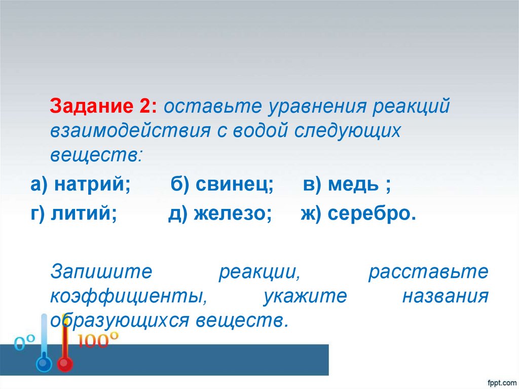 Задание 2: оставьте уравнения реакцийвзаимодействия с водой следующих
