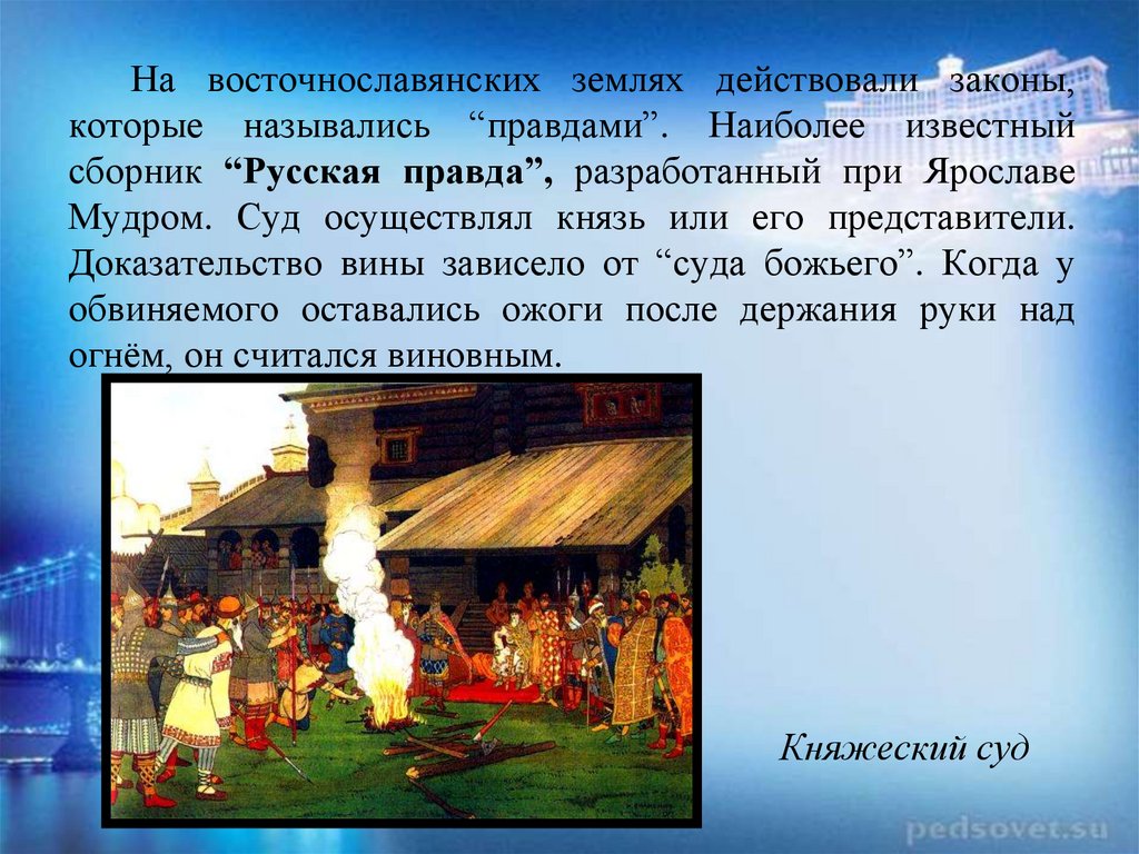 На восточнославянских землях действовали законы,которые назывались “правдами”. Наиболее известный