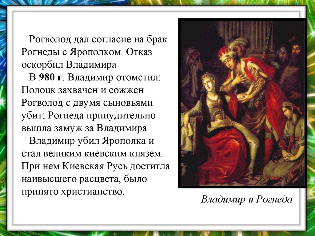 Рогволод дал согласие на бракРогнеды с Ярополком. Отказ