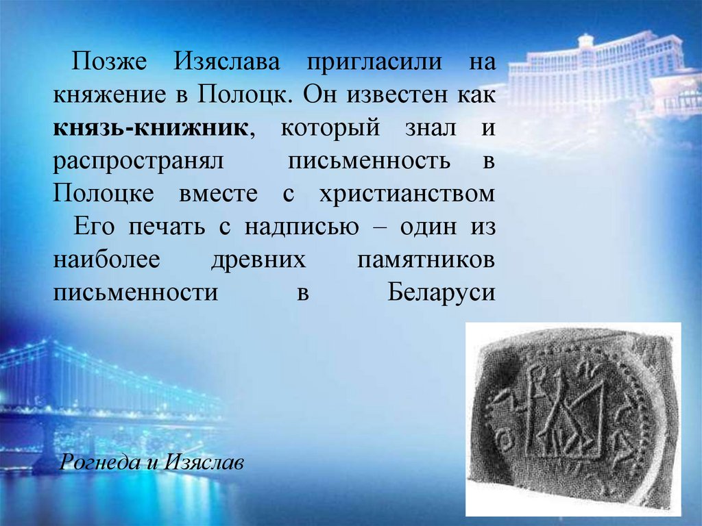 Позже Изяслава пригласили накняжение в Полоцк. Он известен как