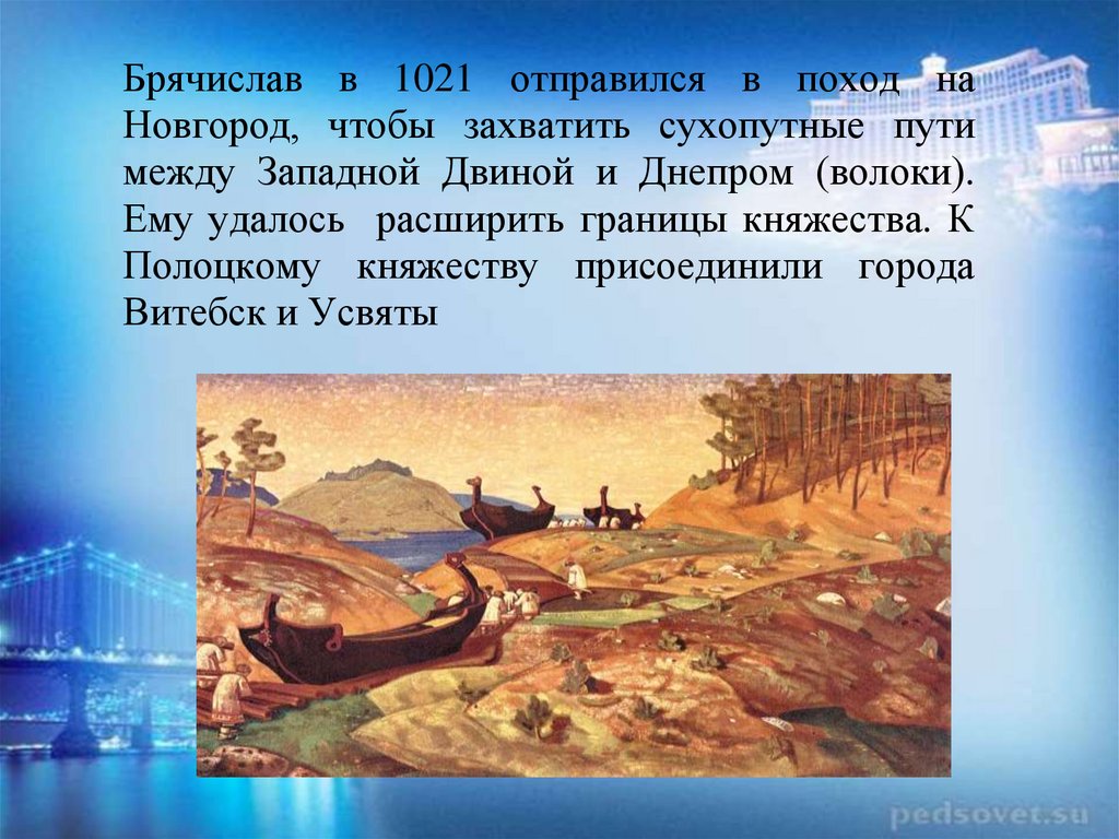 Брячислав в 1021 отправился в поход наНовгород, чтобы захватить сухопутные пути