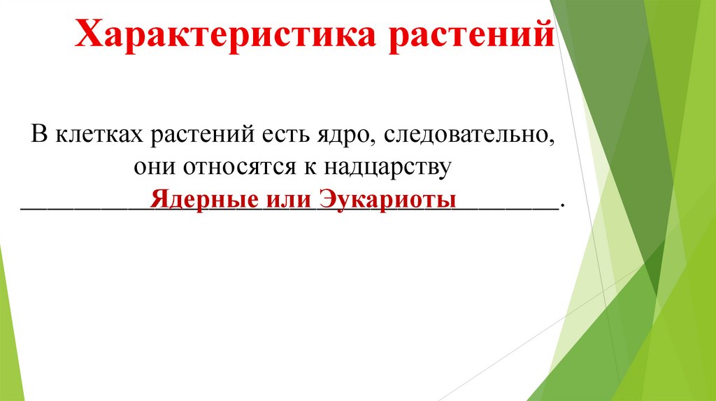 Характеристика растенийВ клетках растений есть ядро, следовательно,