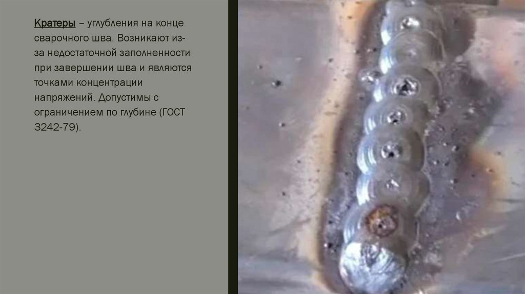 Кратеры – углубления на концесварочного шва. Возникают изза недостаточной заполненности