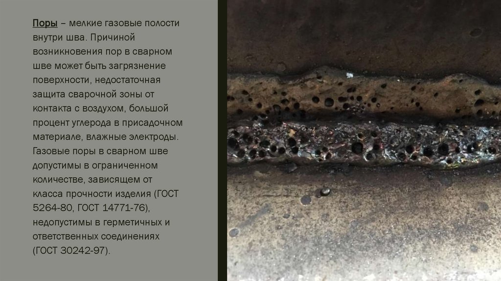 Поры – мелкие газовые полостивнутри шва. Причиной