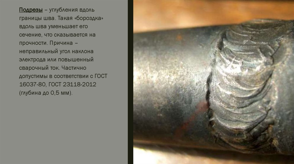 Подрезы – углубления вдольграницы шва. Такая «бороздка»