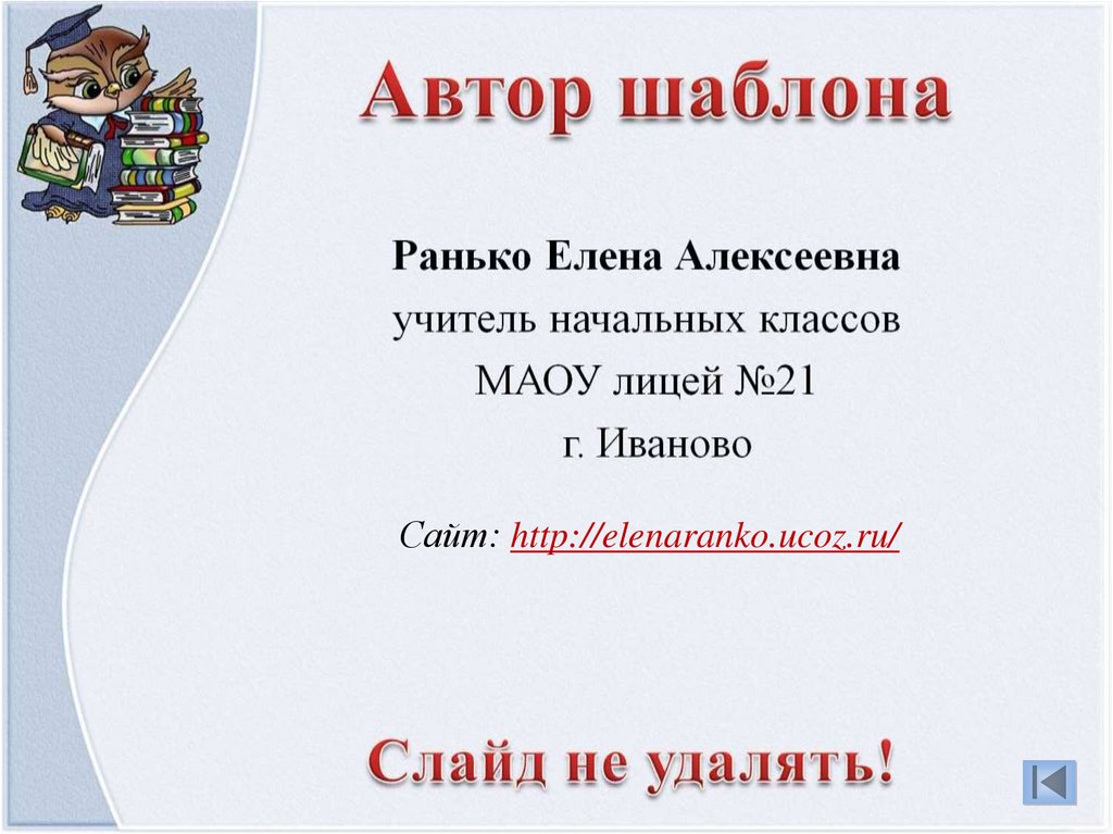 Автор шаблона: учитель начальных классовМАОУ лицея №21 г. Иванова Ранько Елена Алексеевна