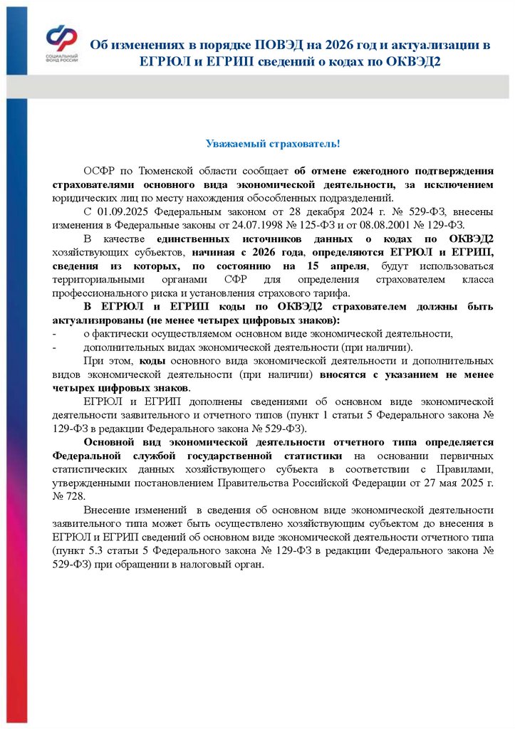Об изменениях в порядке ПОВЭД на 2026 год и актуализации вЕГРЮЛ и ЕГРИП сведений о кодах по ОКВЭД2