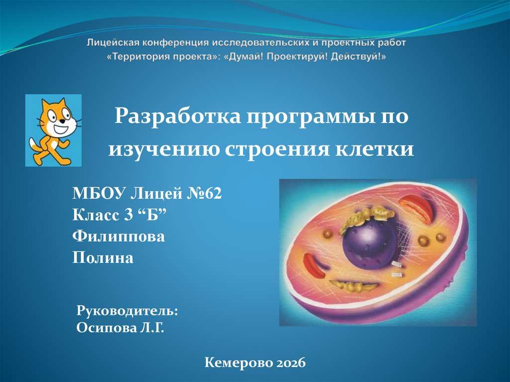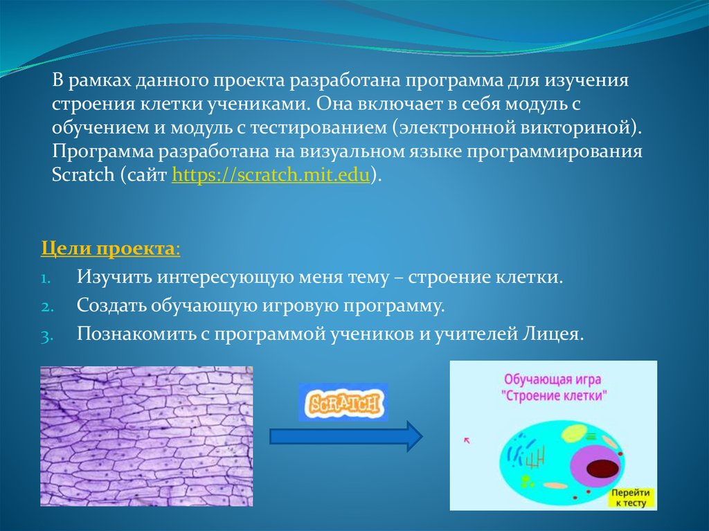 В рамках данного проекта разработана программа для изучениястроения клетки учениками. Она включает в себя модуль с