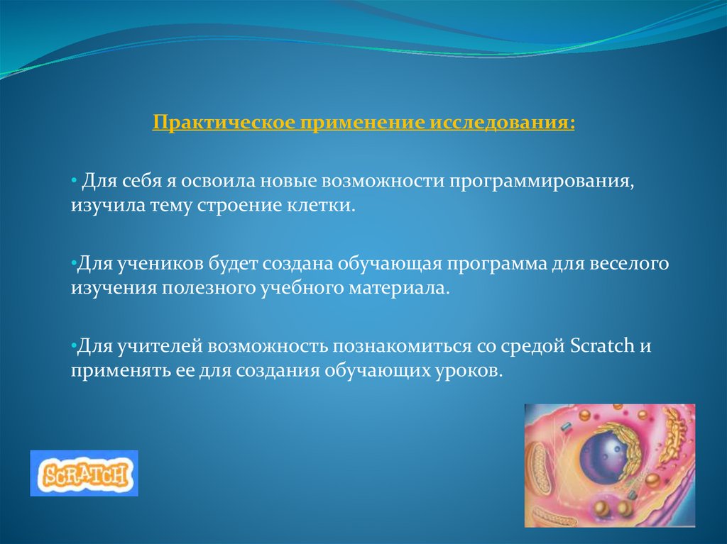 Практическое применение исследования:• Для себя я освоила новые возможности программирования,