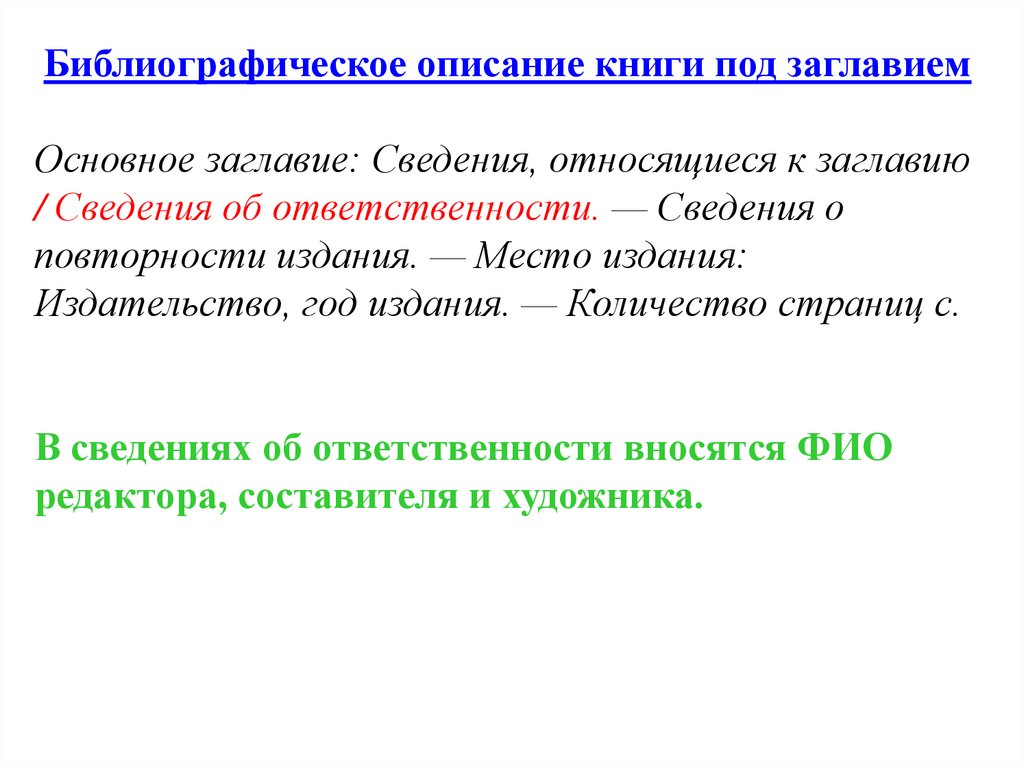 Библиографическое описание книги под заглавиемОсновное заглавие: Сведения, относящиеся к заглавию