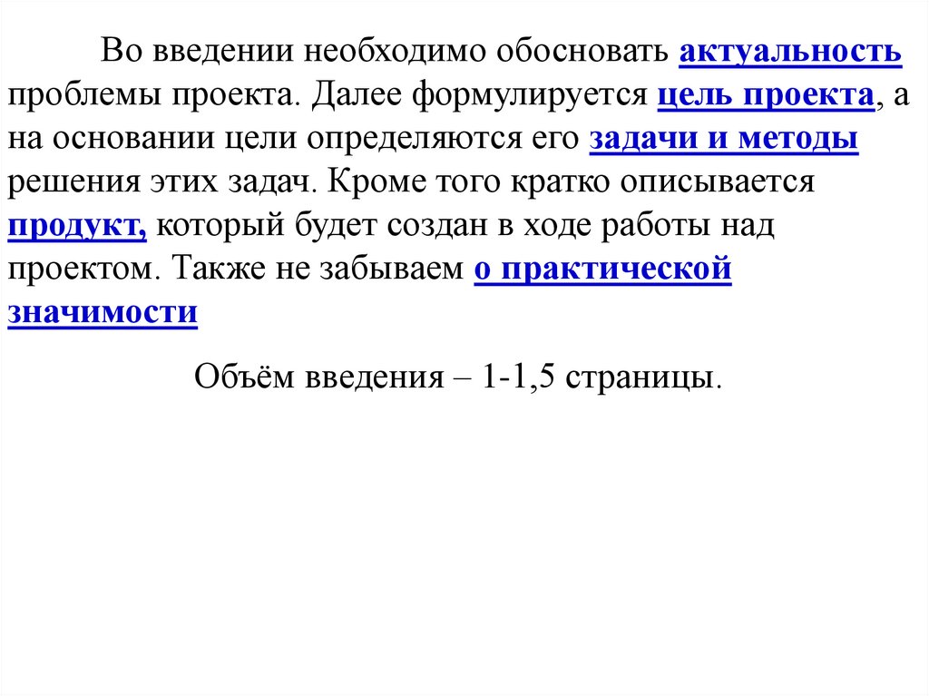 Во введении необходимо обосновать актуальностьпроблемы проекта. Далее формулируется цель проекта, а