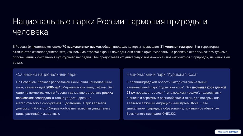В России функционирует около 70 национальных парков, общая площадь которых превышает 31 миллион гектаров. Эти территории