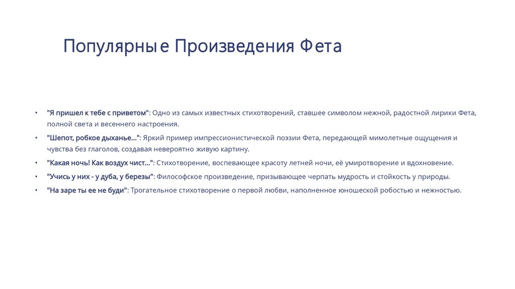 Популярны е Произведения Ф ета"Я пришел к тебе с приветом": Одно из самых известных стихотворений, ставшее символом нежной, радостной лирики Фета,