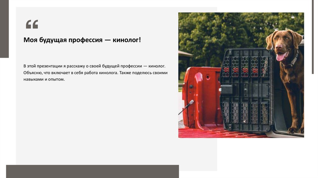 Моя будущая профессия — кинолог!В этой презентации я расскажу о своей будущей профессии — кинолог.