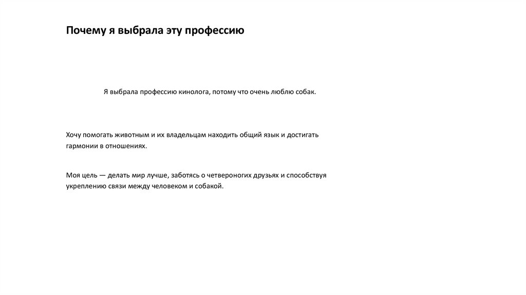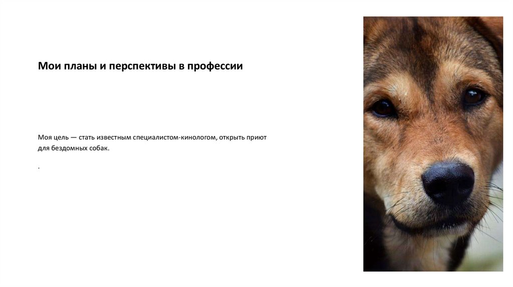 Мои планы и перспективы в профессииМоя цель — стать известным специалистом-кинологом, открыть приют