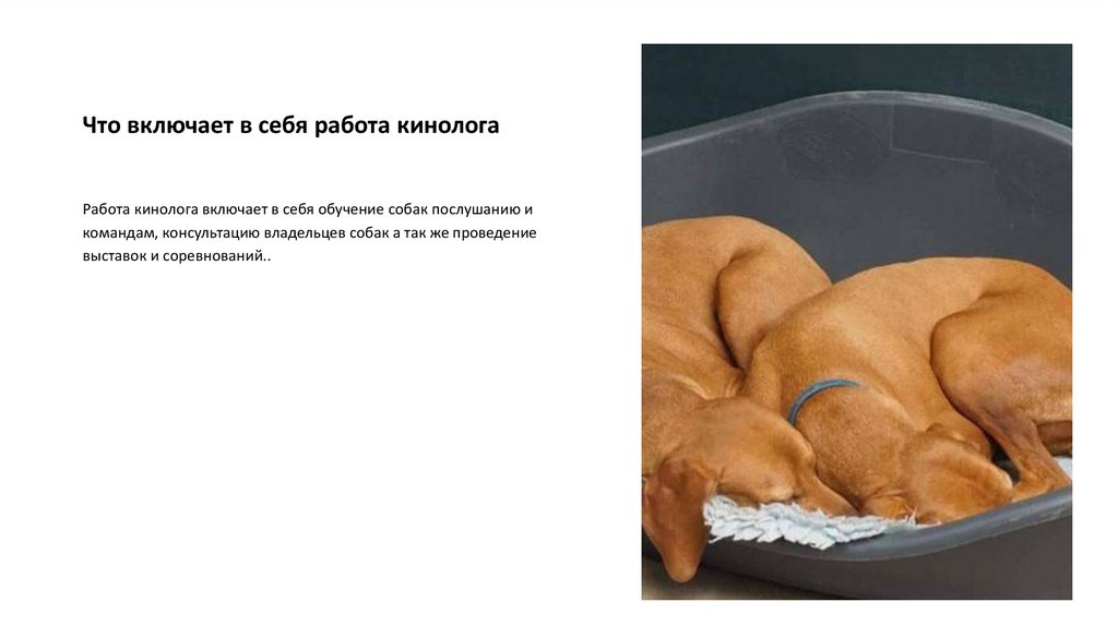 Что включает в себя работа кинологаРабота кинолога включает в себя обучение собак послушанию и