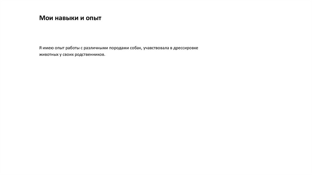 Мои навыки и опытЯ имею опыт работы с различными породами собак, учавствовала в дрессировке
