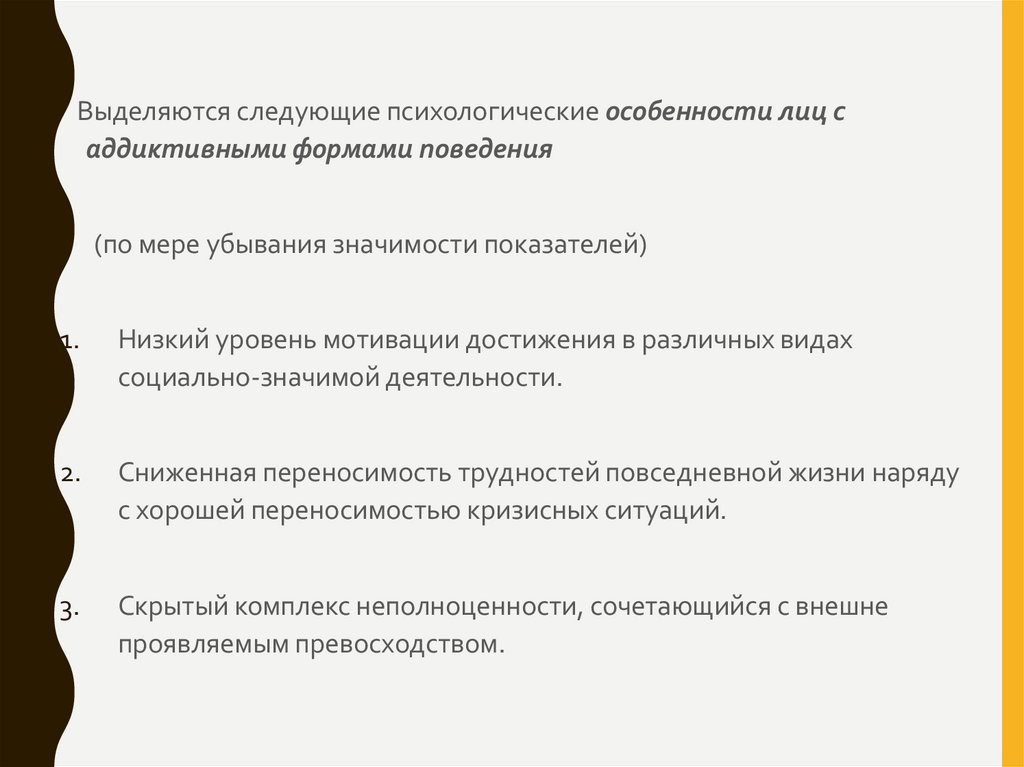 Выделяются следующие психологические особенности лиц саддиктивными формами поведения