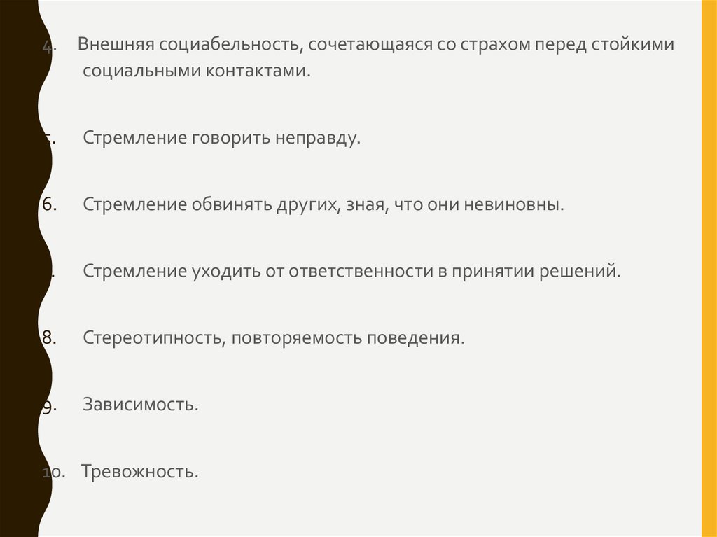 4. Внешняя социабельность, сочетающаяся со страхом перед стойкимисоциальными контактами.