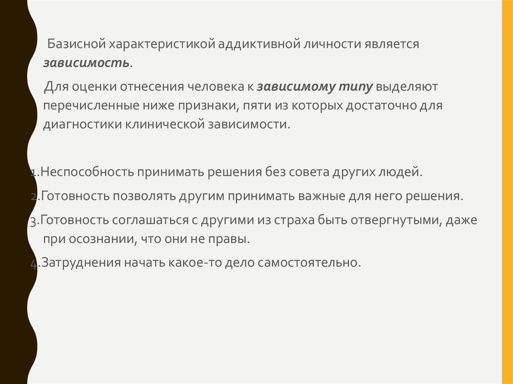 Базисной характеристикой аддиктивной личности являетсязависимость.