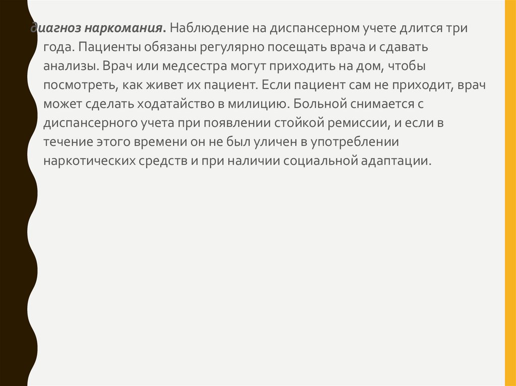 диагноз наркомания. Наблюдение на диспансерном учете длится тригода. Пациенты обязаны регулярно посещать врача и сдавать