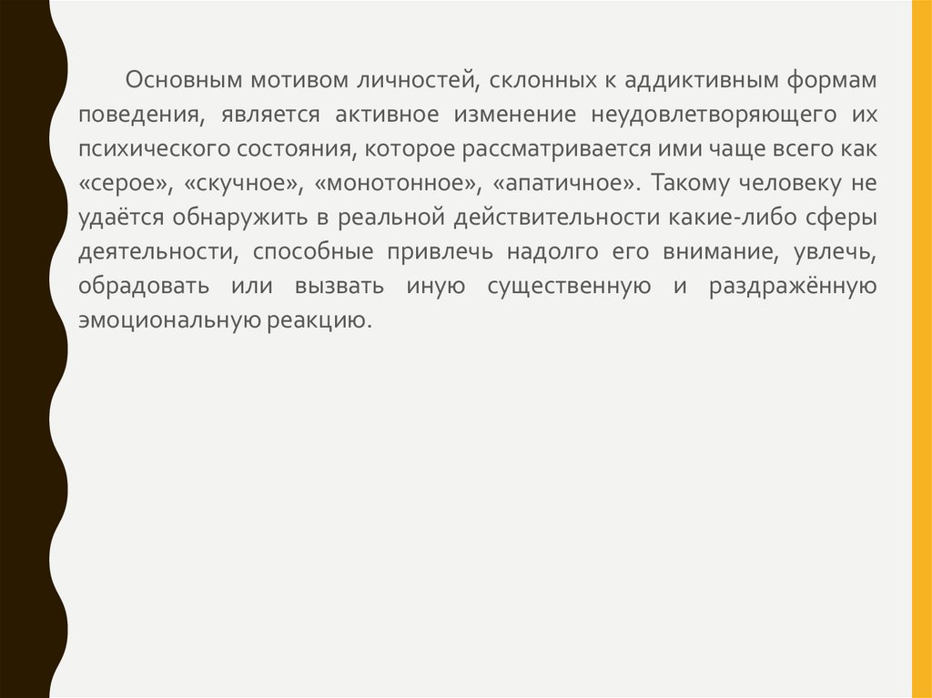 Основным мотивом личностей, склонных к аддиктивным формамповедения, является активное изменение неудовлетворяющего их