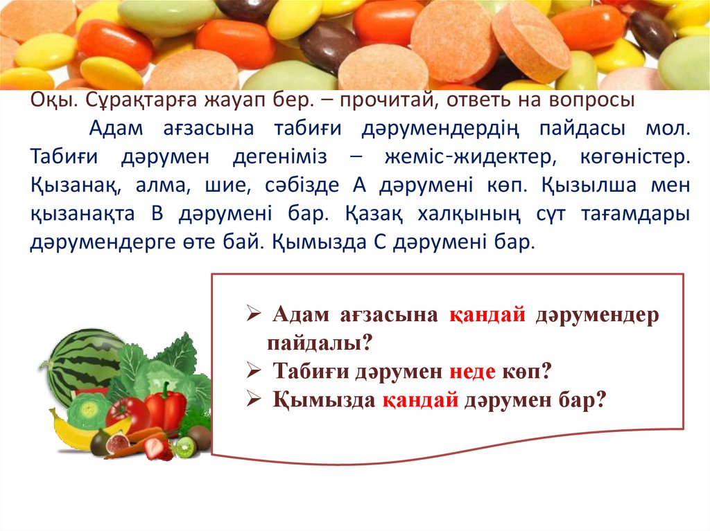 Оқы. Сұрақтарға жауап бер. – прочитай, ответь на вопросыАдам ағзасына табиғи дәрумендердің пайдасы мол.