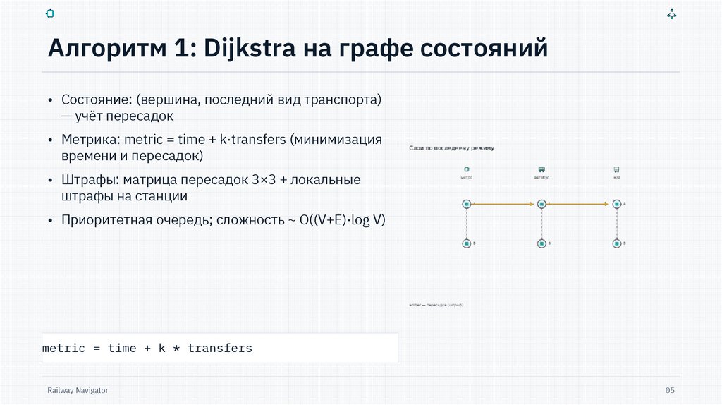 Алгоритм 1: Dijkstra на графе состояний• Состояние: (вершина, последний вид транспорта)