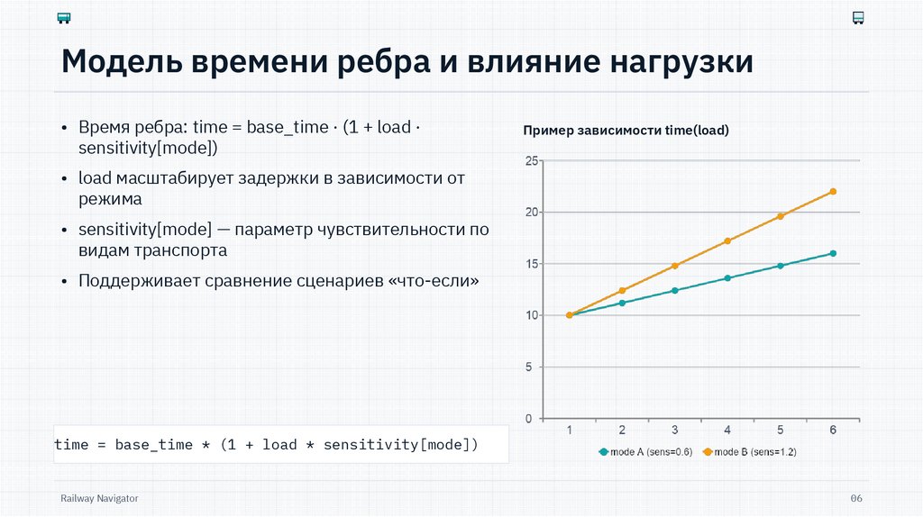 Модель времени ребра и влияние нагрузки• Время ребра: time = base_time · (1 + load ·