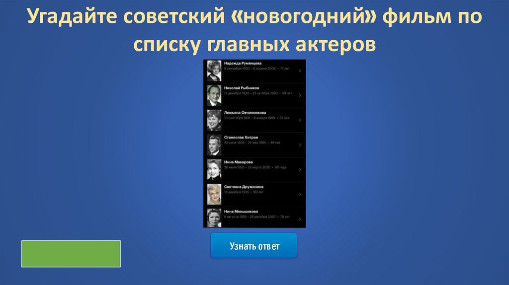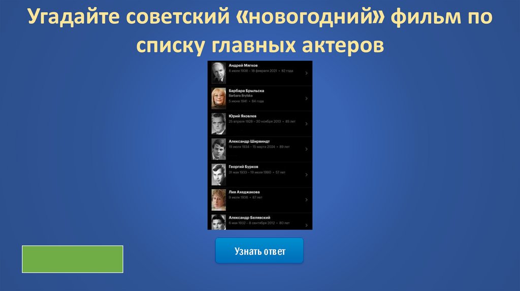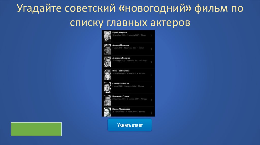 Угадайте советский «новогодний» фильм посписку главных актеров