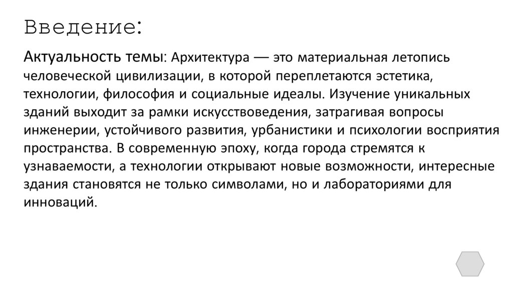 Введение:Актуальность темы: Архитектура — это материальная летопись