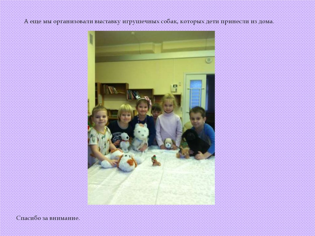 А еще мы организовали выставку игрушечных собак, которых дети принесли из дома.Спасибо за внимание.