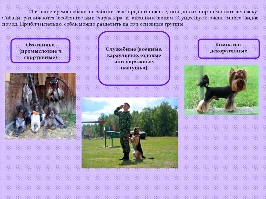 И в наше время собаки не забыли своё предназначенье, они до сих пор помогают человеку.Собаки различаются особенностями характера и внешним видом. Существует очень много видов