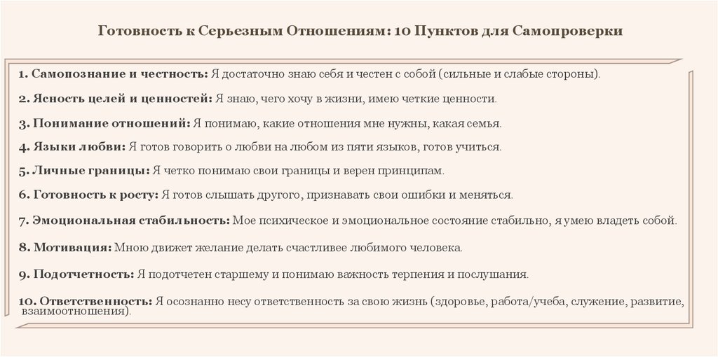 Готовность к Серьезным Отношениям: 10 Пунктов для Самопроверки1. Самопознание и честность: Я достаточно знаю себя и честен с собой (сильные и слабые стороны).