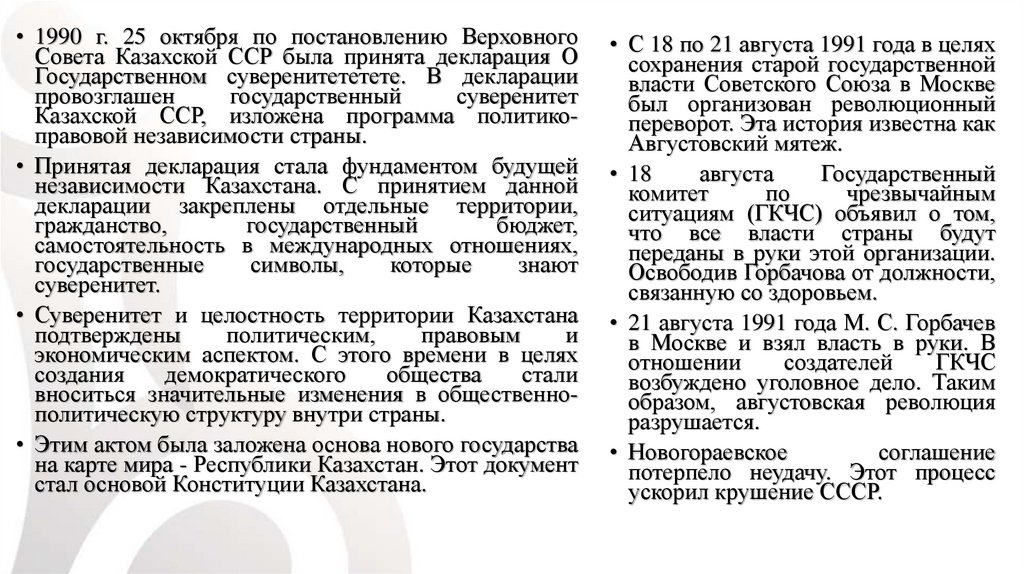 • 1990 г. 25 октября по постановлению ВерховногоСовета Казахской ССР была принята декларация О