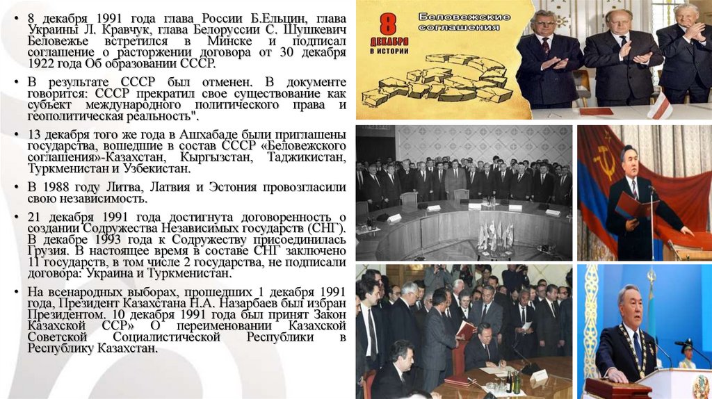 • 8 декабря 1991 года глава России Б.Ельцин, главаУкраины Л. Кравчук, глава Белоруссии С. Шушкевич