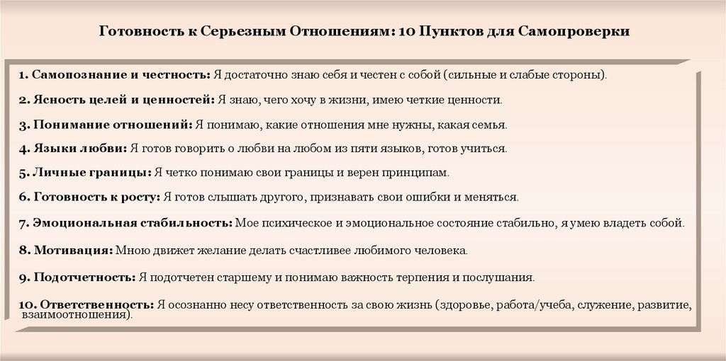 Готовность к Серьезным Отношениям: 10 Пунктов для Самопроверки1. Самопознание и честность: Я достаточно знаю себя и честен с собой (сильные и слабые стороны).